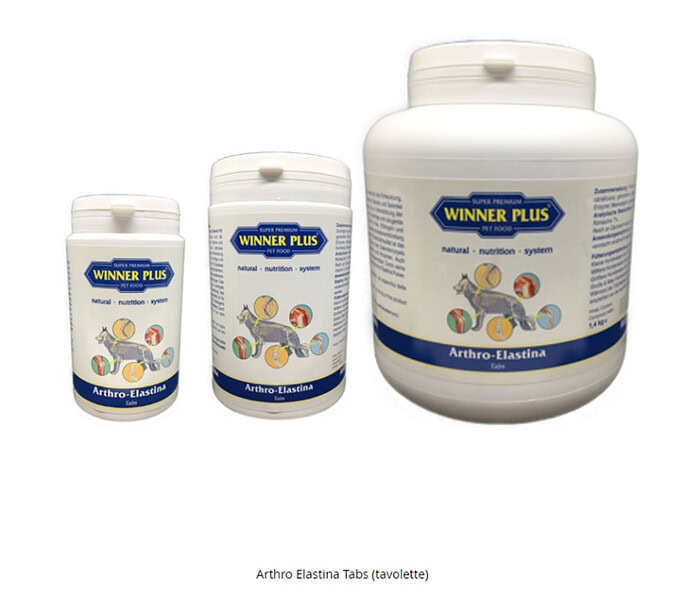 WINNER PLUS Arthro Elastina Tabs – Integratore articolare in tavolette con Perna canaliculus, ricco di glicosaminoglicani. Supporta la salute di articolazioni, tendini e legamenti in cani di tutte le età. Formulazione pratica in compresse facili da somministrare. Ideale per crescita, displasia e cani attivi.